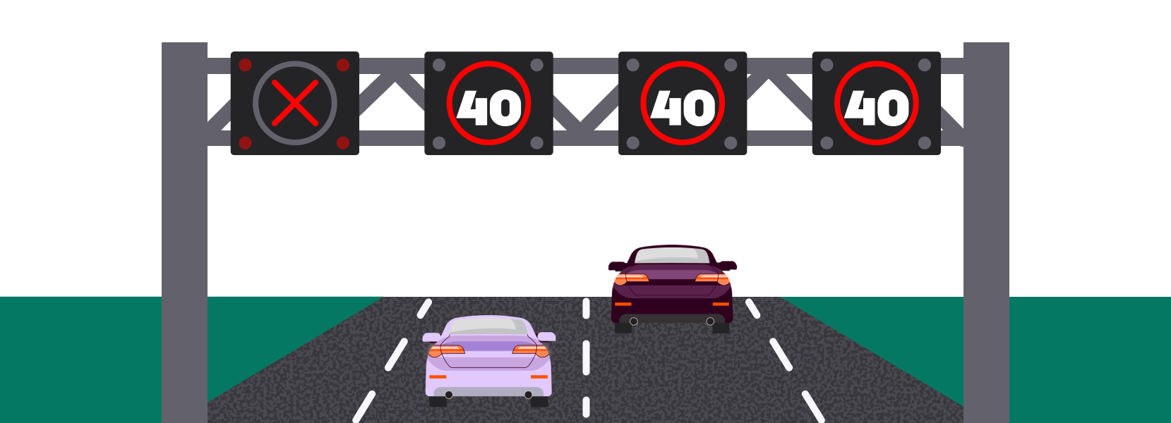 Variable speed limits are displayed on either illuminated electric signs at the side of the road or on overhead motorway gantries. They will let you know when a VSL is in use and when it ends.
