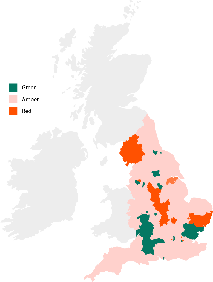 This map uses a traffic light system (red, amber, green) to show how effectively 154 local authorities are maintaining local roads.